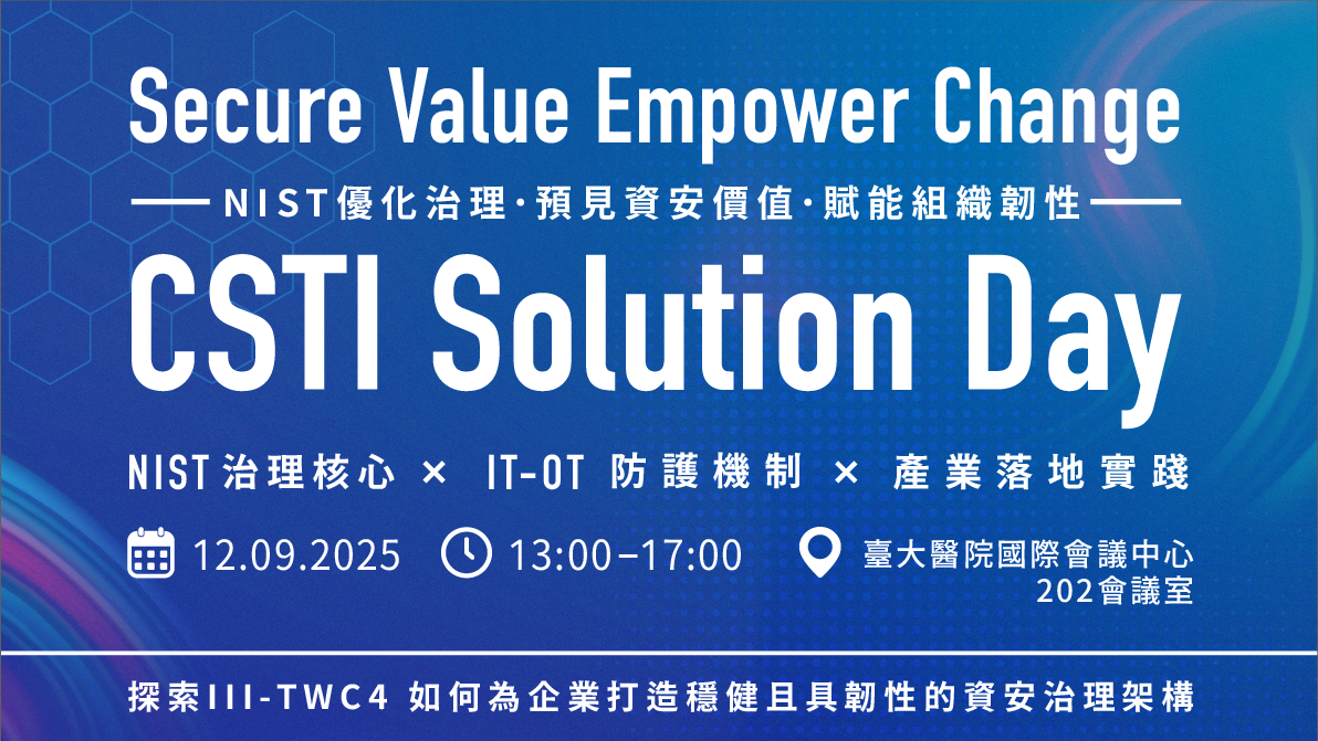 CSTI Solution Day — Secure Value Empower Change本次活動聚焦 NIST 治理核心、供應鏈韌性、IT–OT 防護機制與實務落地,並邀請 BSI、安永及本所專家分享最新趨勢與案例,協助企業強化資安治理與組織韌性,同時帶領您深入探索 III-TWC4 如何為企業打造高效、穩固且具備韌性的資安治理營運架構,從趨勢洞察到實務部署完整掌握資安治理發展,並深入理解實務應用知識與技巧。 🔥 活動亮點:NIST CSF 2.0 與 AI 安全:探討網路安全治理與技術的商業變革。合規與驗證:聚焦企業防護關鍵弱點,強化治理成熟度。供應鏈新標準:提升國際信任,解析資料保護要求。跨越 IT/OT 邊界:建立混域資安風險的整合防禦策略。 📅 時間:2025 年 12 月 9 日(二)13:00~17:00📍 地點:臺大醫院國際會議中心 202 會議室(台北市中正區徐州路 2 號 2 樓)👥 資格:開放一般民眾參加💰 費用:免費 無論您是資安長、IT 管理者或稽核人員,這都是一場不容錯過的實務交流盛會!立即報名:https://ievents.iii.org.tw/EventS.aspx?t=0&id=3075 主辦單位:資策會資安科技研究所協辦單位:中華民國資訊軟體服務商業同業公會、資安應用服務聯盟合作夥伴:BSI 英國標準協會、安永諮詢服務股份有限公司媒體夥伴:社團法人台灣電子商務暨創業聯誼協會 圖/CSTI Solution Day - Secure Value Empower Change