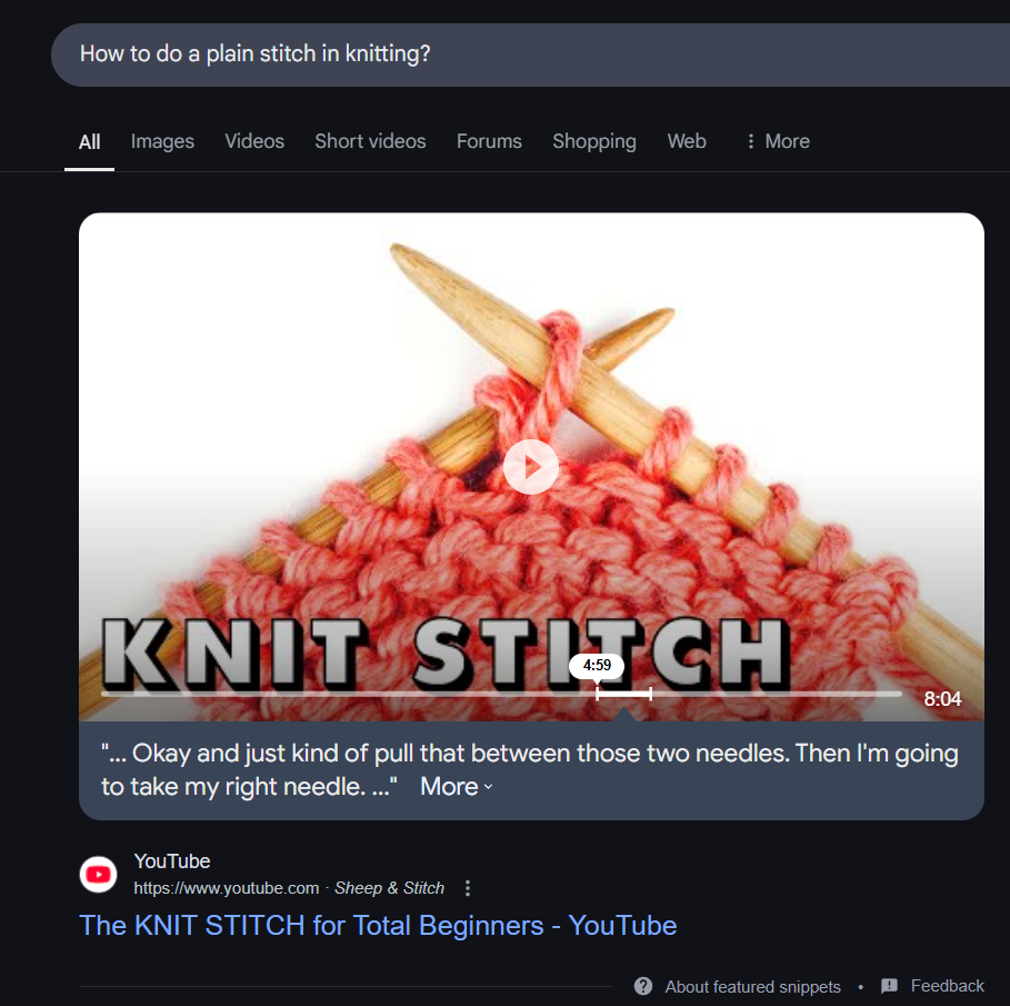 會以影片(通常來自 YouTube)作為主要答案,經常會突顯影片中的某個特定片段,但在中文搜尋結果中幾乎不太會出現,在英文的搜尋結果中比較會呈現。主要針對需要視覺化教學或演示的類型查詢內容,如下圖範例的 “How to do a plain stitch in knitting”。