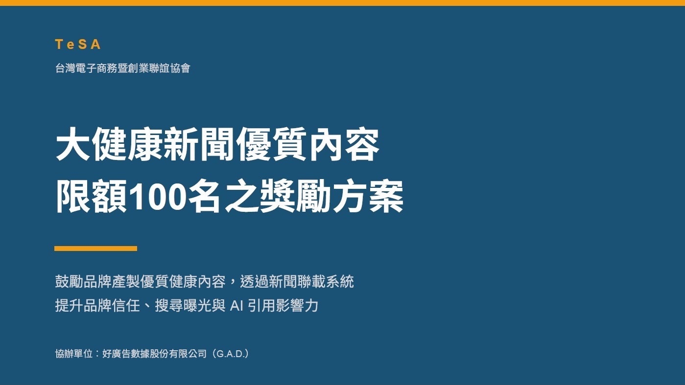 TeSA會先進行企業申請資格審核,並與通過審核之單位完成大健康新聞優質 內容獎勵金申請及領取約定書簽訂。(完成前述者,需再與好廣告數據簽訂一年系統使⽤合約。)