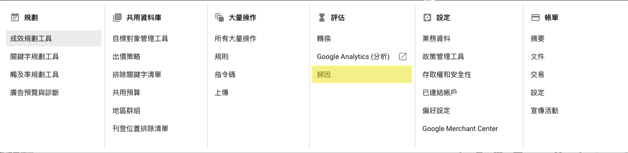 進入所有廣告活動的頁面後點選畫面右上方的工具與設定,選擇評估類別中的歸因。
