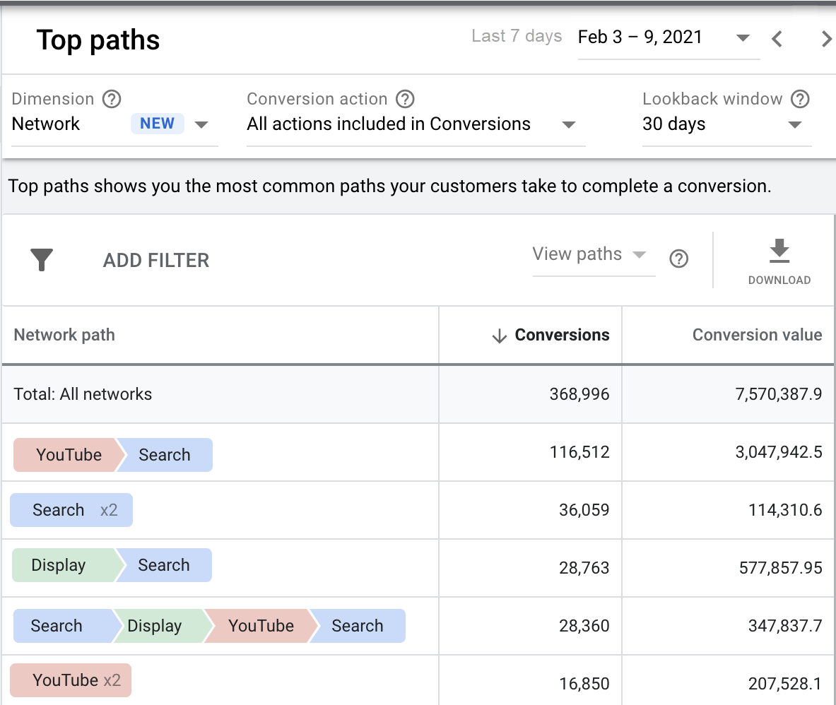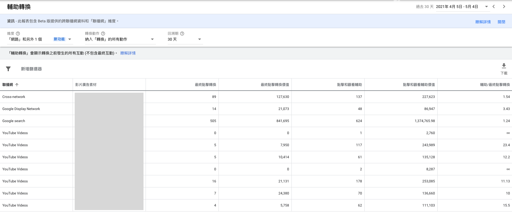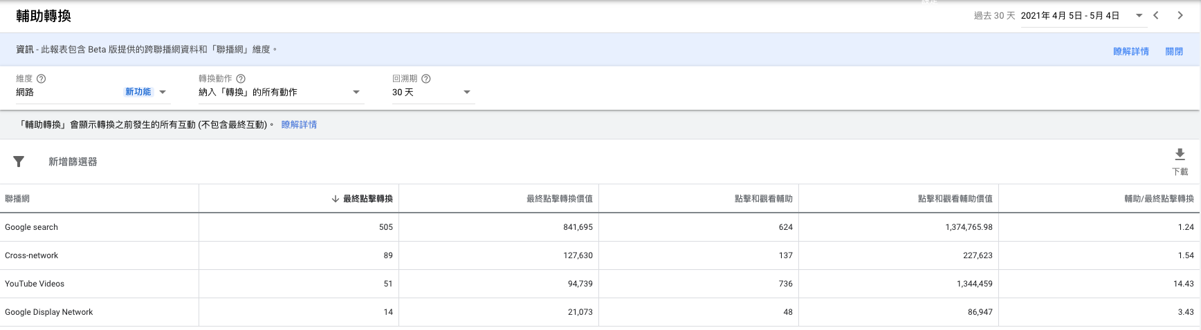 過去在 Google Ads 的歸因報表上,我們只能看到搜尋廣告的相關數據,2020年 Google Ads 推出了全新介面的歸因報表,其中納入 YouTube 廣告與多媒體廣告,讓我們不在只能以觀看次數、觀看率等指標來判斷影片廣告的成效,能更進一步了解影片廣告在轉換路徑中扮演的角色,雖然目前部分功能仍是 Beta 版,但有了此功能我們就能以一致的歸因標準來判斷跨聯播網的廣告成效。