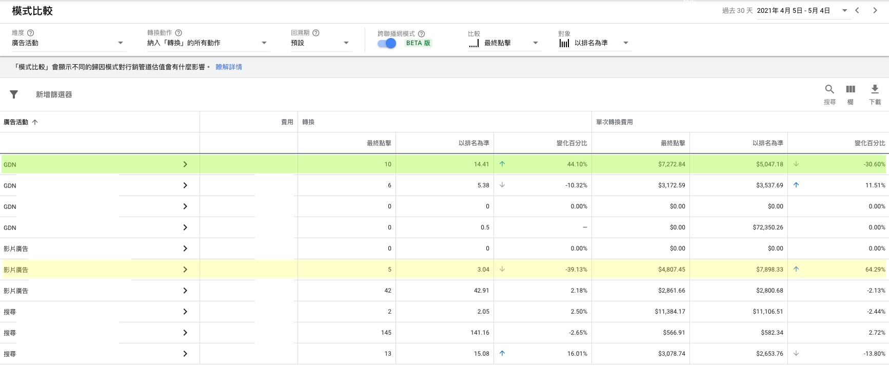 我們以上圖的廣告為例,用廣告活動的維度比較「最終點擊」與「以排名為準」這兩種歸因模式解讀轉換功勞,拉出其中的影片廣告,可發現此廣告活動用「最終點擊」獲得的轉換數優於「排名為準」的歸因,顯示此廣告活動的策略較屬於直接轉換;相反的,綠底的 GDN 廣告,我們發現以「排名為準」獲得的轉換數優於「最終轉換」,顯示此活動在整體廣告中對於輔助轉換與直接轉換皆有貢獻。
