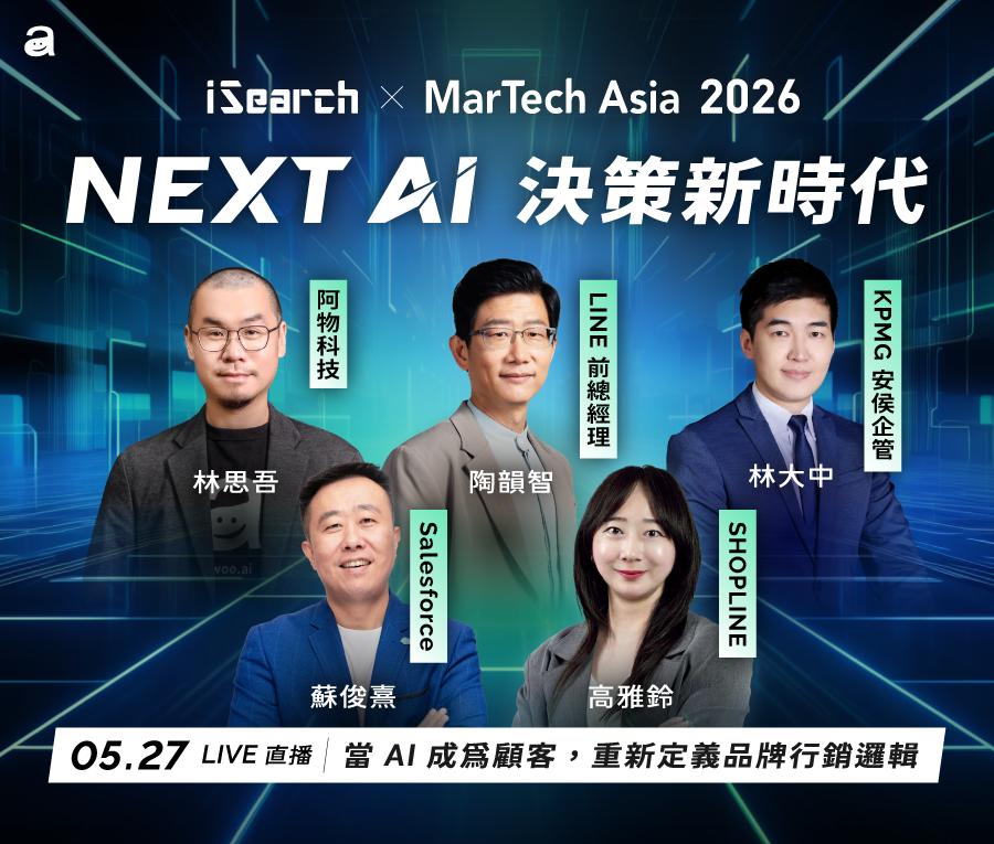 2026 年全球產業迎來十年來最劇烈的震盪,生成式 AI 引發的新一代轉型革命已成為全球企業的共同課題。年度行銷盛會《iSearch x MarTech Asia 2026》將於 5 月 27 日(三)以線上直播形式盛大登場,以「Next AI 決策新時代:當 AI 成為顧客,重新定義品牌行銷邏輯」為年度主題,集結頂尖 AI 與行銷科技專家,共同探討品牌如何在 GEO 與 AI Agent 生態中搶佔先機,為下一個十年的品牌成長提前卡位。