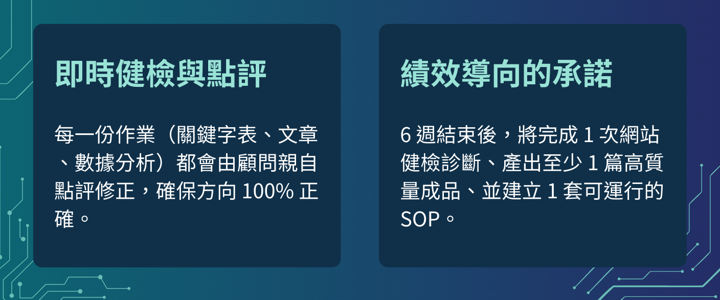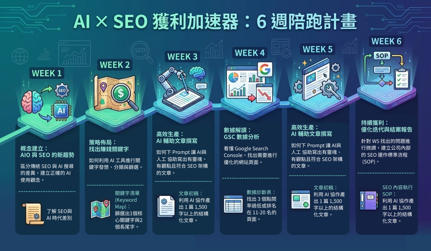 目標不是學會,而是完成。6 週結束後,您將完成 1 次網站健檢診斷、產出至少 1 篇高質量成品、並建立 1 套可運行的 SOP。