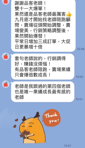掃描賣場體質的問題、抓出賣場漏洞,讓你更有效地系統化經營蝦皮賣場,從選品策略、行銷策略、到廣告投放技巧,顧問都能有答必問,協助學員能夠找到自己的問題、找出創業初期容易忽略的細節,告訴你需要突破的關卡與盲點,讓你賣場業績衝起來!